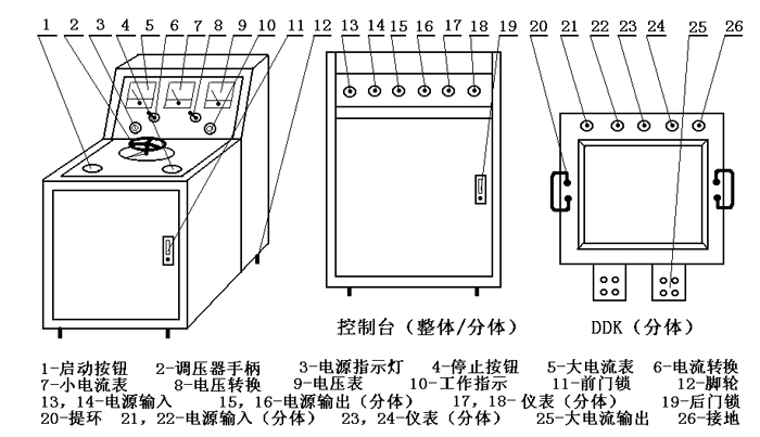 - 本产品属台式可移动式结构,2000A规格以下产品为整体式(即大电流DDK部分和控制部分为一体),